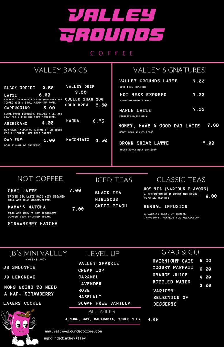 Valley Grounds Coffee Menu has the kind of comforting charm you hope to find when wandering along 14524 Ventura Blvd in Sherman Oaks. As you flip through their offerings, you notice how the menu leans into warm, easygoing flavors-nothing pretentious, just good coffee done well. There’s a smooth transition from classic drip options to richer espresso drinks, and each one feels thoughtfully put together.